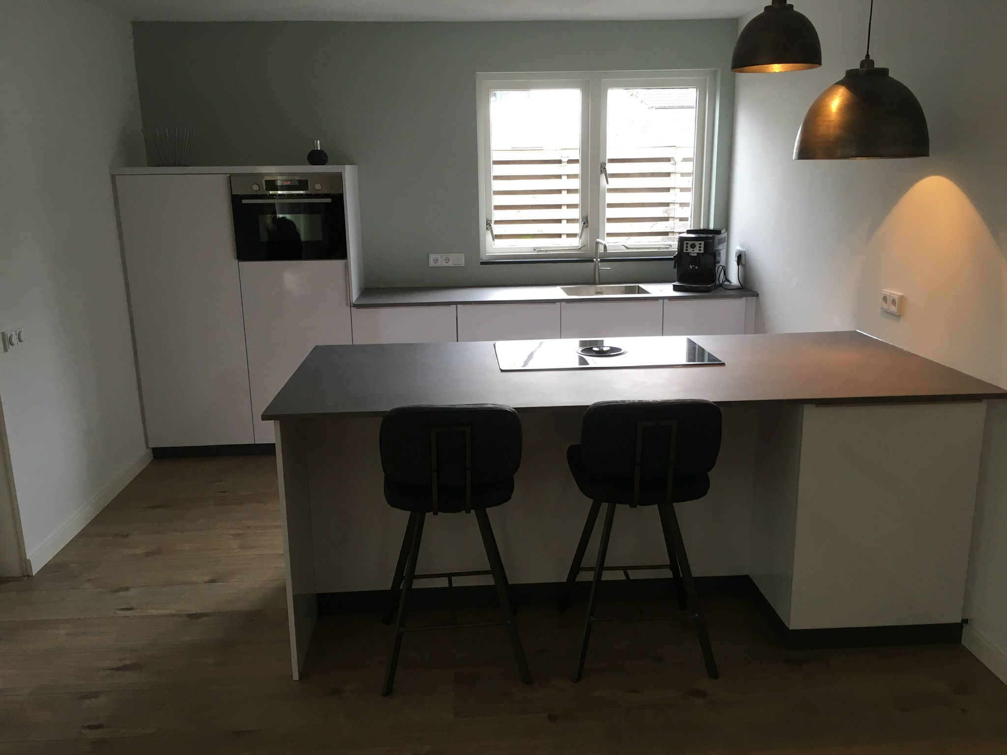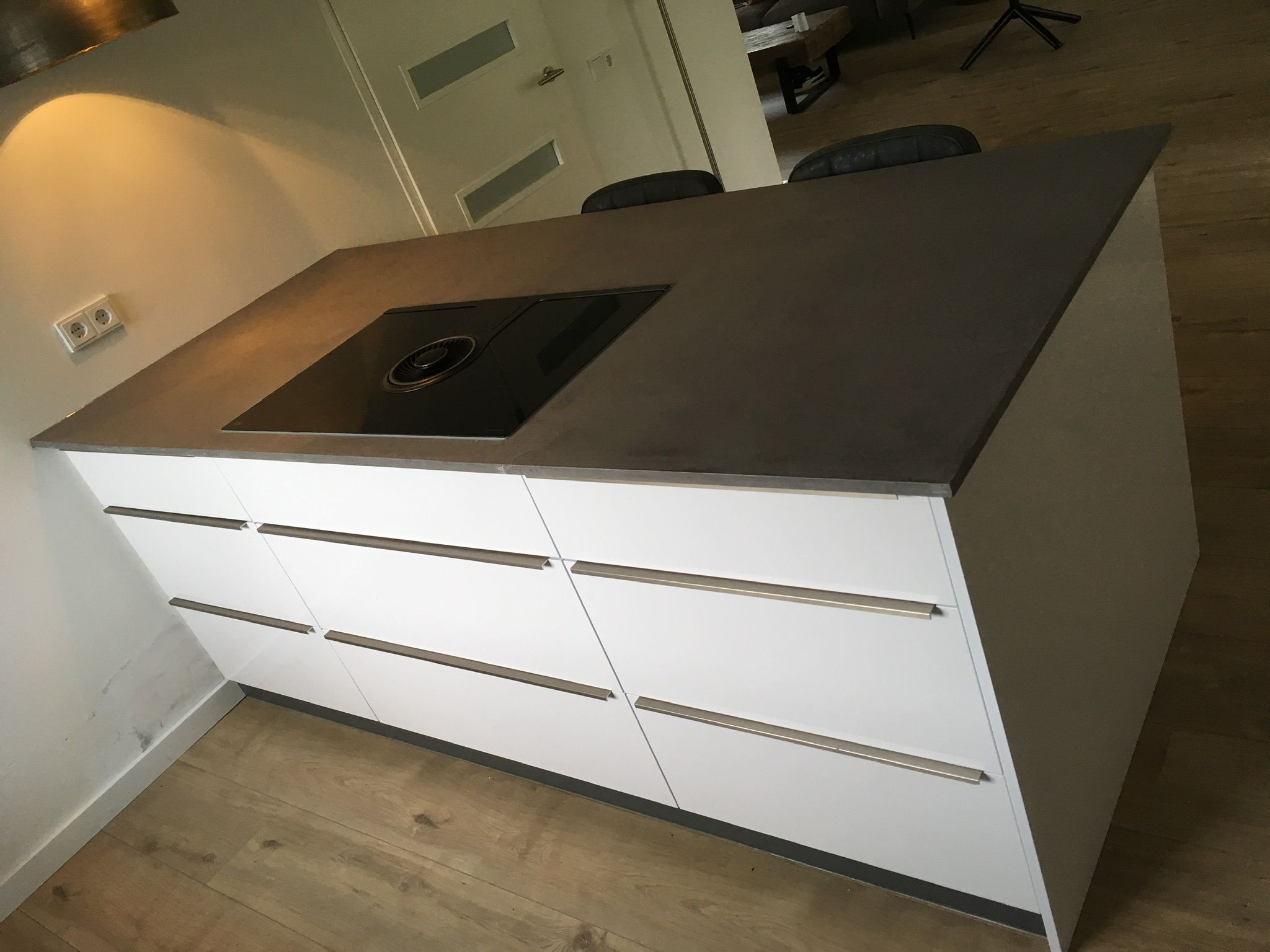 Hoogglans witte keuken met een grijs/antraciet kleur gestukadoord aanrechtblad. Bora kookplaat is ingebouwd in het eiland blad.