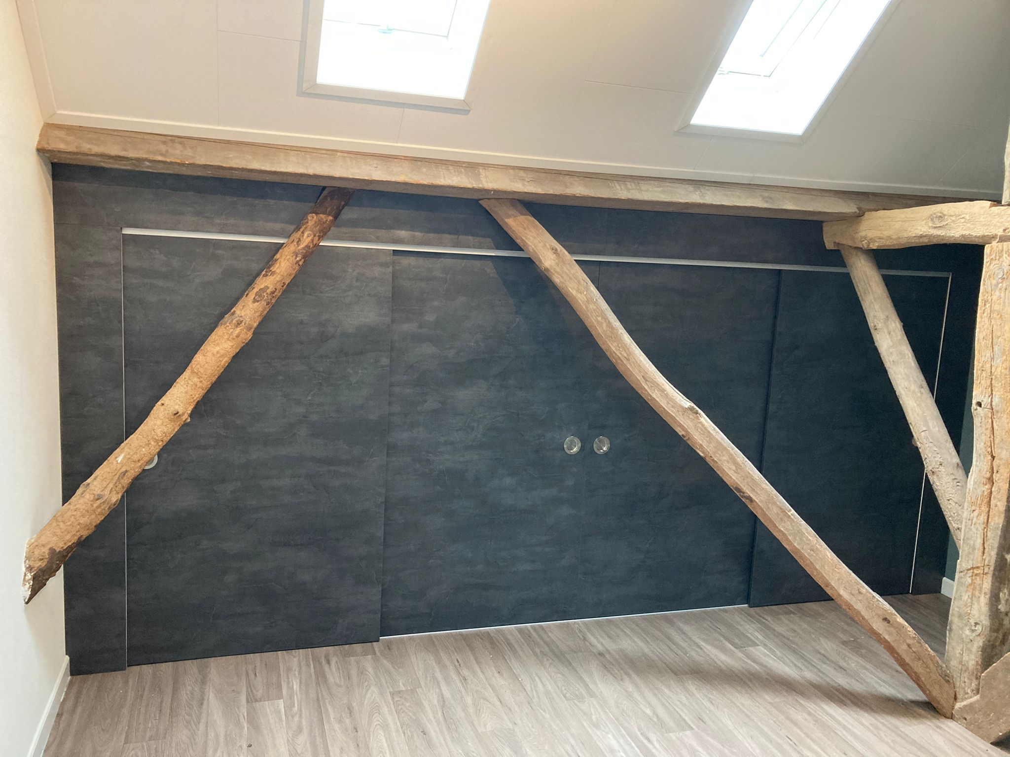Schuifdeurenkast met 4 grote kasten achter de deuren met hang en leg gedeeltes.