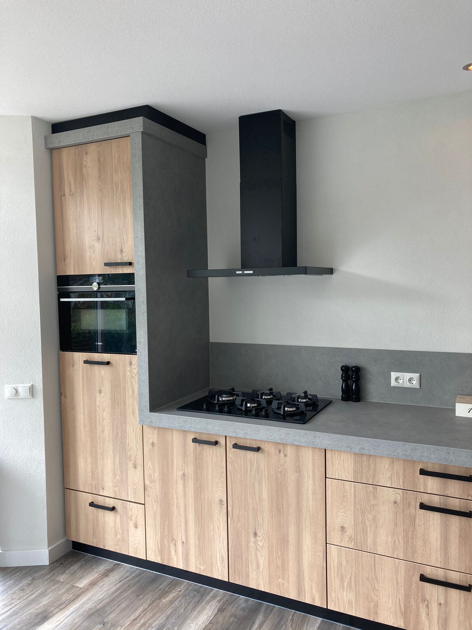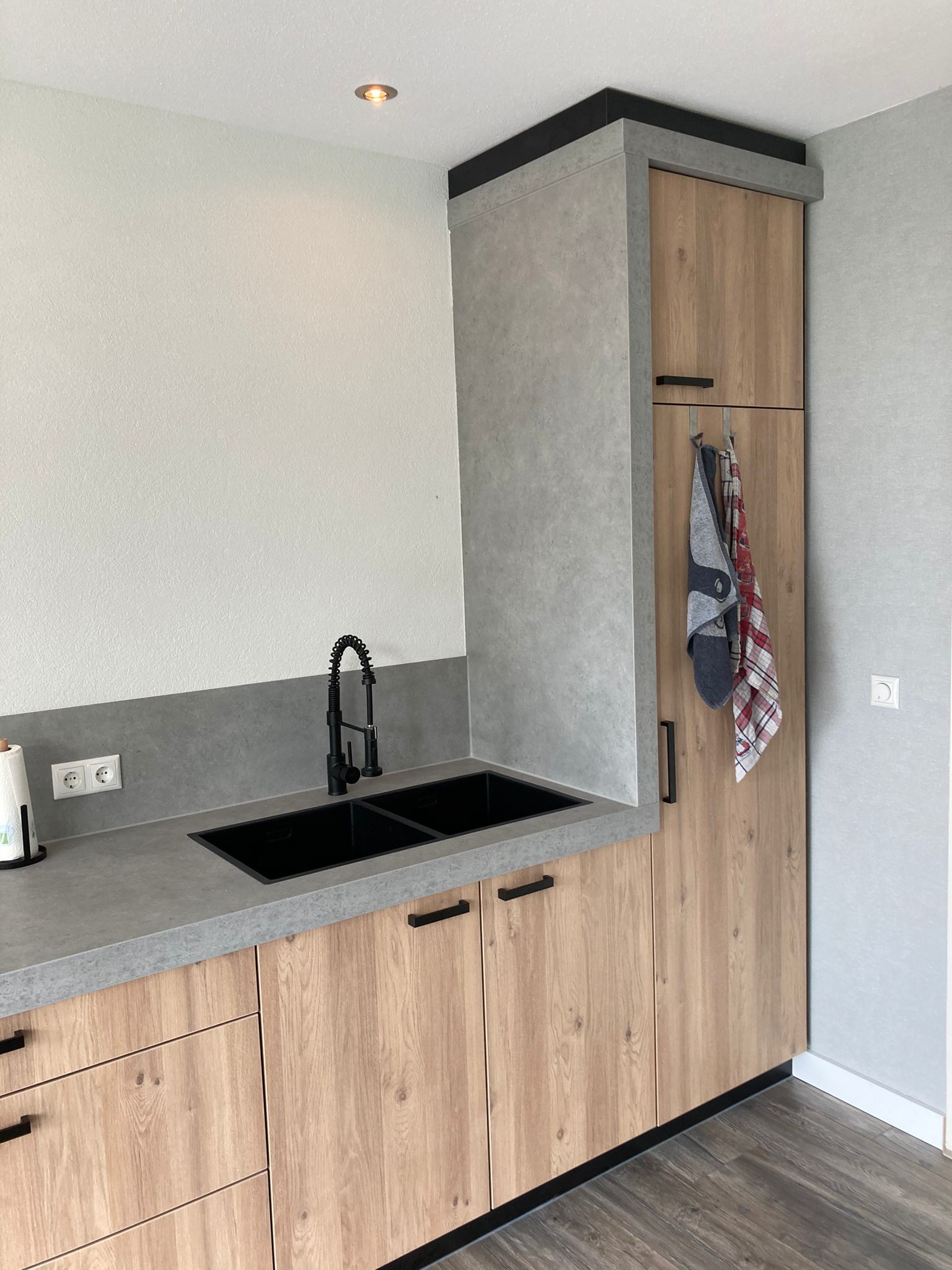 Keuken met een extra dik blad van bijna 70 mm; steen en houtstructuur is en blijft een leuke combinatie.