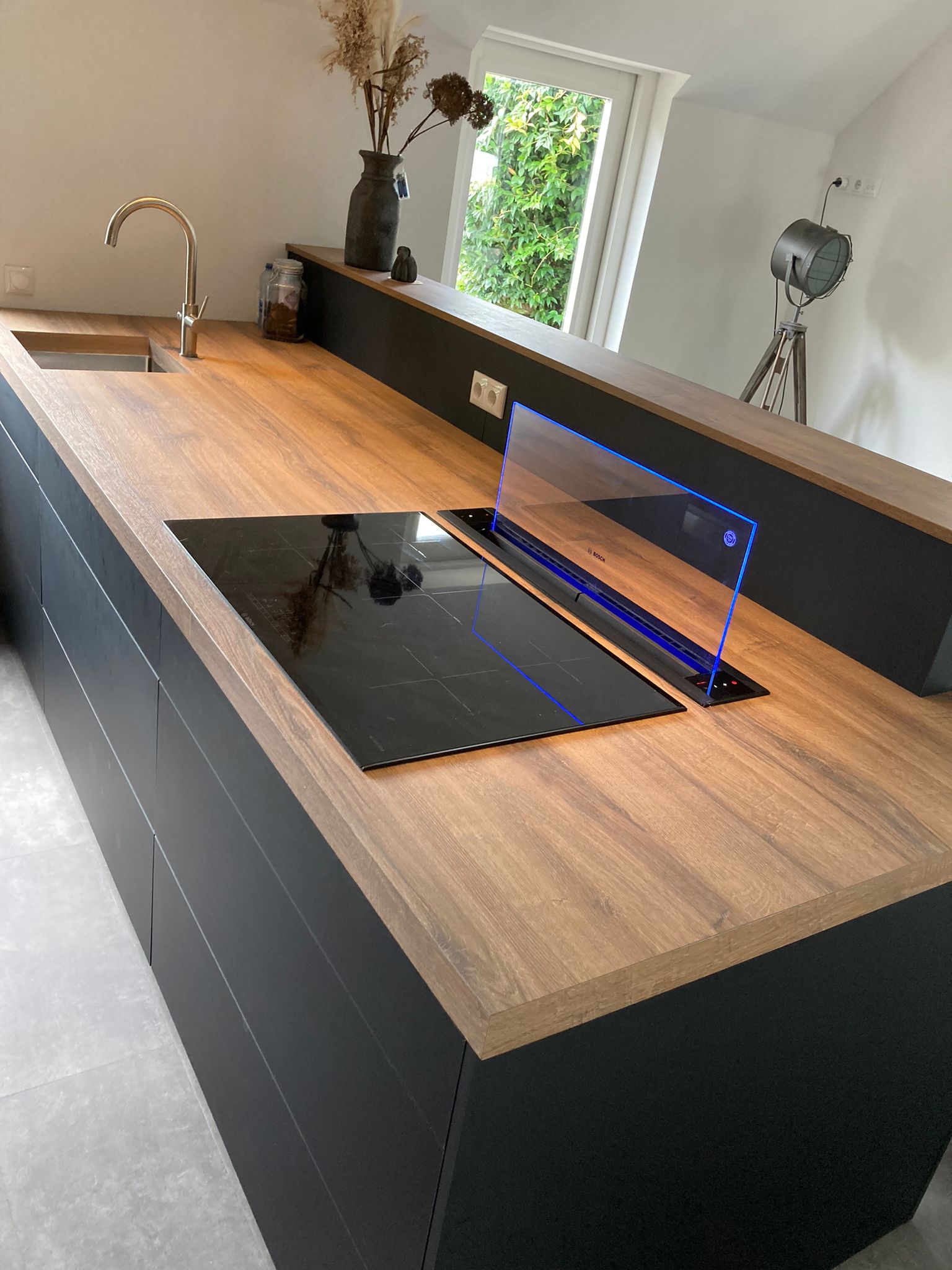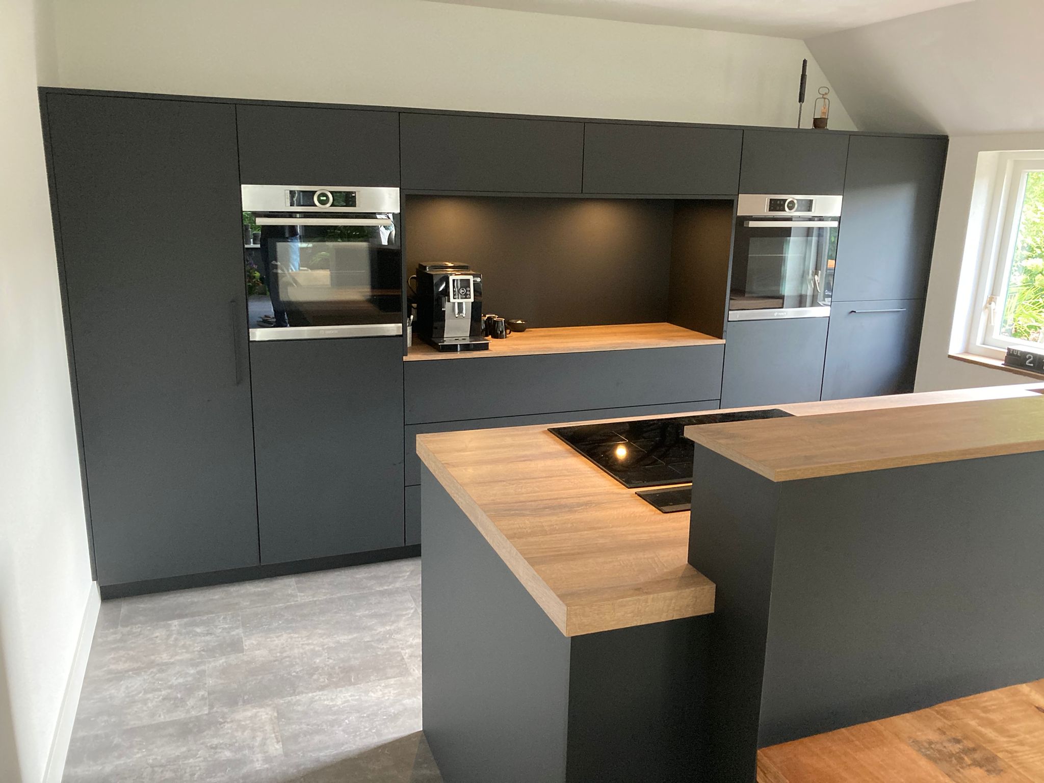 Mat zwarte keuken met push to open functie Bosch apparatuur ingebouwd.