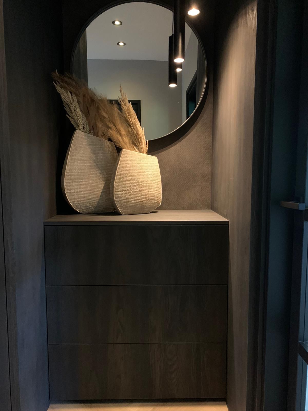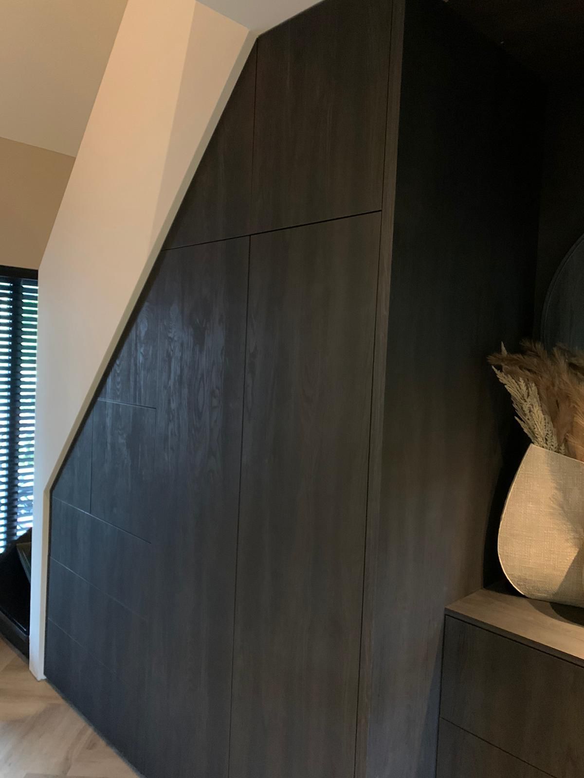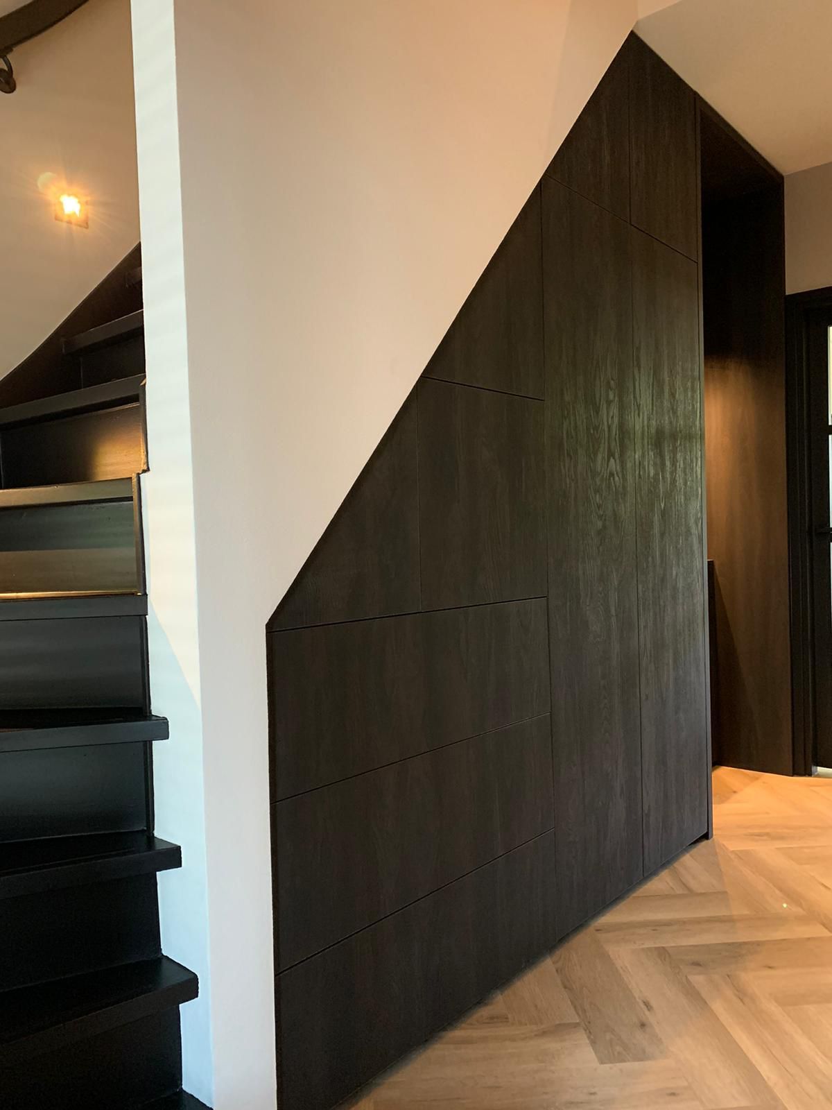 Deze kast is op maat ingebouwd onder een trap. Bij de kast is een nisje verwerkt, waardoor het licht is en er een strak geheel effect is. Deze uitwerking is op maat en in de gepaste kleur te bestellen. De kast is afgewerkt met push to open, waardoor het geheel strak blijft.